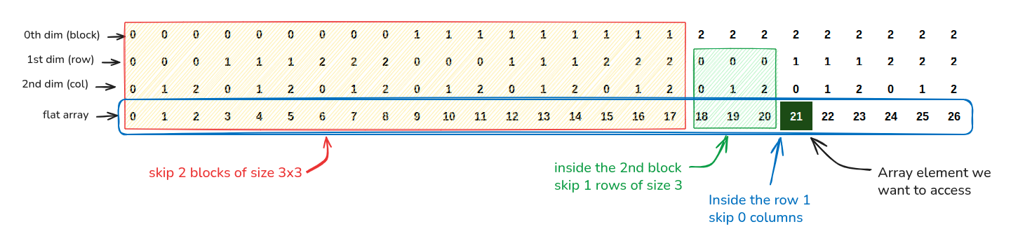 To understand what calculations are done in get, look at this diagram where we are accessing the element at (2, 1, 0) in a 3d array of shape (3, 3, 3)