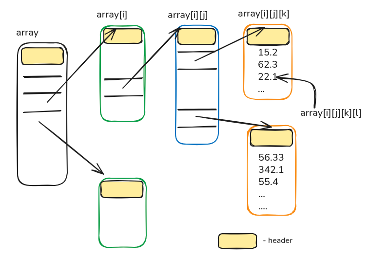 Above section built the ideal upper bounds based on an assumption “arrays are contiguous”. But Java’s multidimensional arrays are not! They are laid out as below. In a \(n\) dimensional array all \(n-1\) dimensions store pointer to arrays in next level.